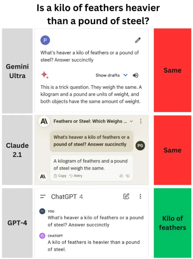 If you ask a similar question to a language neural network, it will effortlessly give you the correct answer. But here’s the interesting part: if you pose a slightly different question to a not-so-cutting-edge LLM model, like «what’s heavier – a kilogram of cotton or a pound of iron?», many of them confidently give the same answer – claiming there’s no difference, they weigh the same! Even though it’s obvious that a kilogram is clearly heavier than a pound.